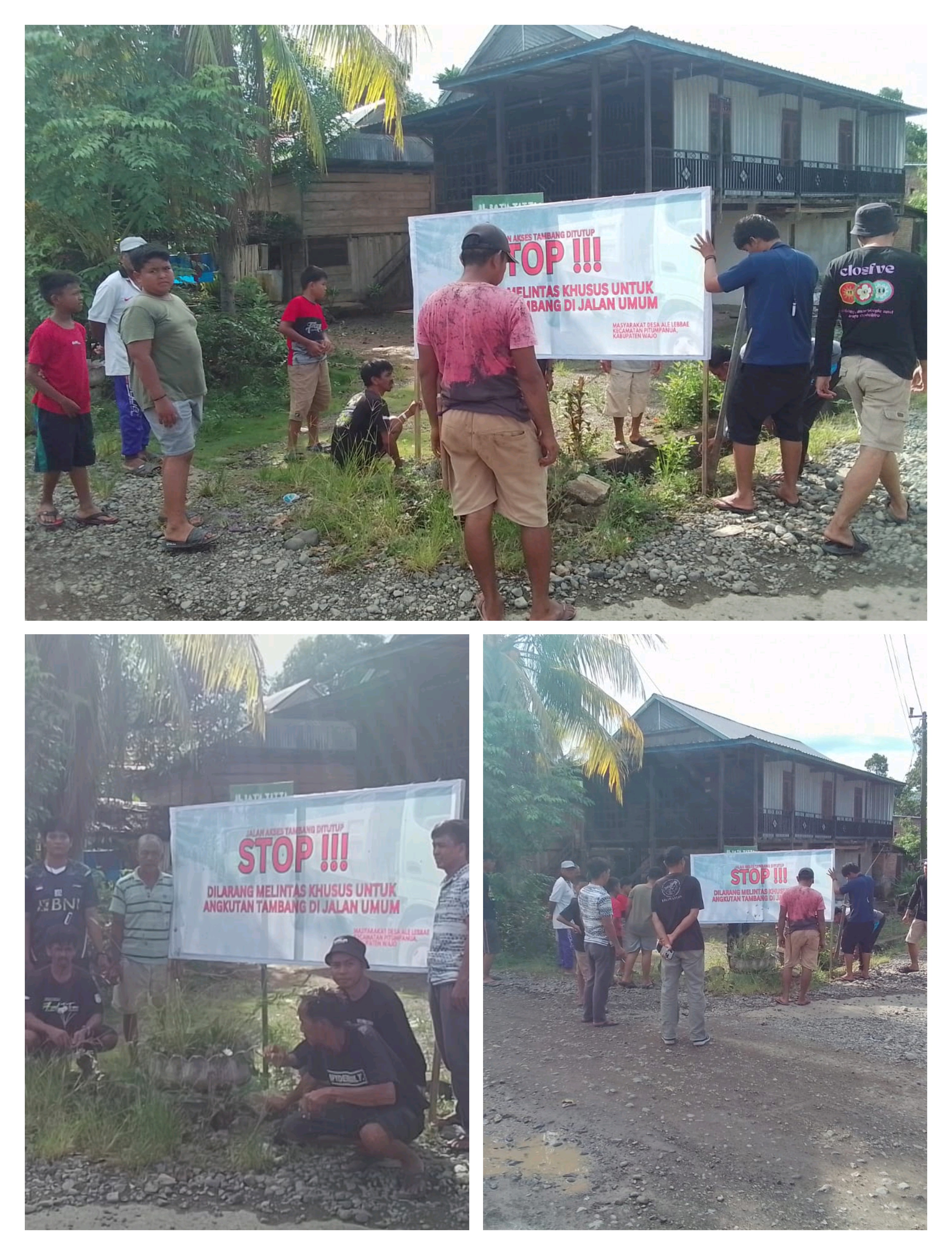 Bentuk aksi protes tidak lagi dengan batang pisang dijejer di jalan, kini masyarakat Desa Alelebbae pasang spanduk bertuliskan ” Stop, dilarang melintas khusus angkutan tambang di jalan umum”.