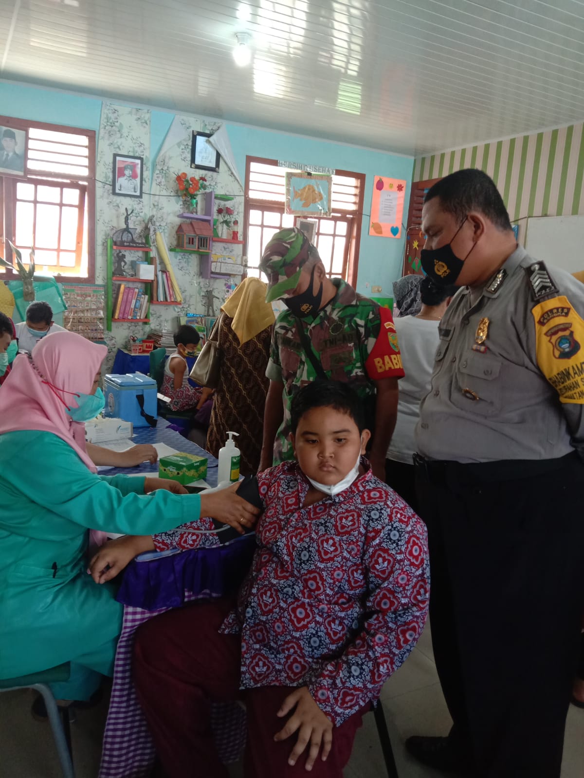 Babinsa Sertu Hasanuddin memantau wilayah binaan vaksinasi di SD 8 dusun Mentabak desa Penyamun Kec.Pemali, Serka Saukani.memantau wilayah vaksinasi di SD 28 Kel. Sungailiat Kec Sungailiat, Serda Yulianto memantau wilayah vaksinasi di Kel.Matras Kec.Sungailiat, Sertu Gunawan memantau vaksinasi di SD 11 desa Bakam, Kec.Bakam.