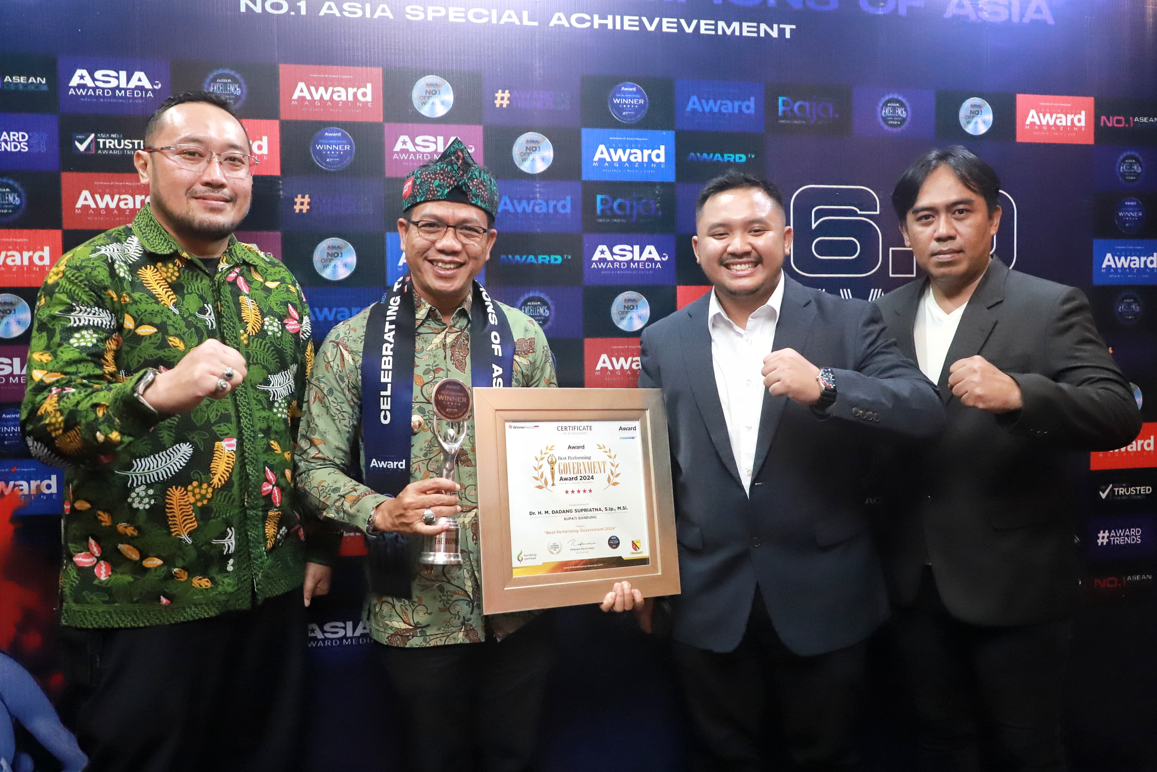Bupati Dadang Supriatna menerima penghargaan bintang lima ini dengan katagori “Best Performing Government Award 2024”, sebagai Kepala Daerah yang Innovative, Inspiring dan Renewable pada tingkat ASEAN. Penghargaan ini merupakan yang ke-325 selama tiga tahun lebih menjadi orang nomor satu di Kabupaten Bandung.