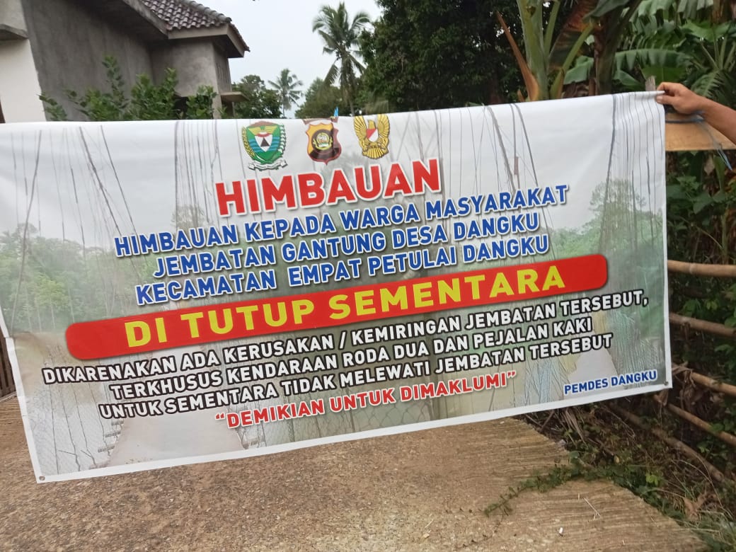 Jembatan yang sangat dibutuhkan oleh masyarakat ini, terputus dan rusak parah sudah lebih dari 1 bulan, sehingga menyebabkan terkendalanya sambungan transportasi yang dapat di gunakan masyarakat dengan desa lain nya disekitar desa Dangku, disebabkan harus memutar sangat jauh untuk bisa keluar dari desa Dangku ke desa lain nya.