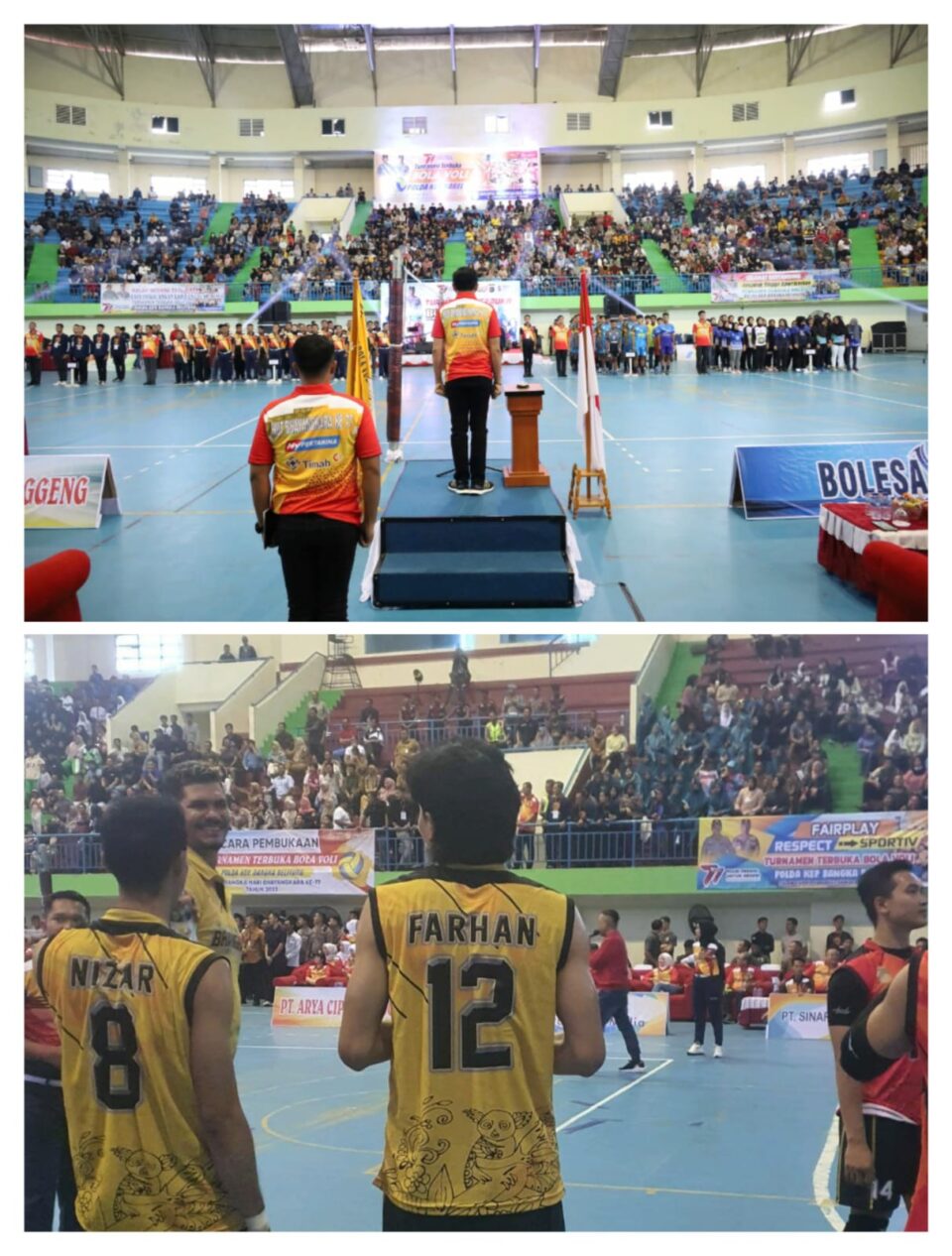 Tampak antusias warga Bangka Belitung pada pembukaan turnamen terbuka lomba bola voli yang dilaksanakan di Gor Sahabudin ini membuat kursi di Tribun Gor Sahabudin penuh akan penonton.