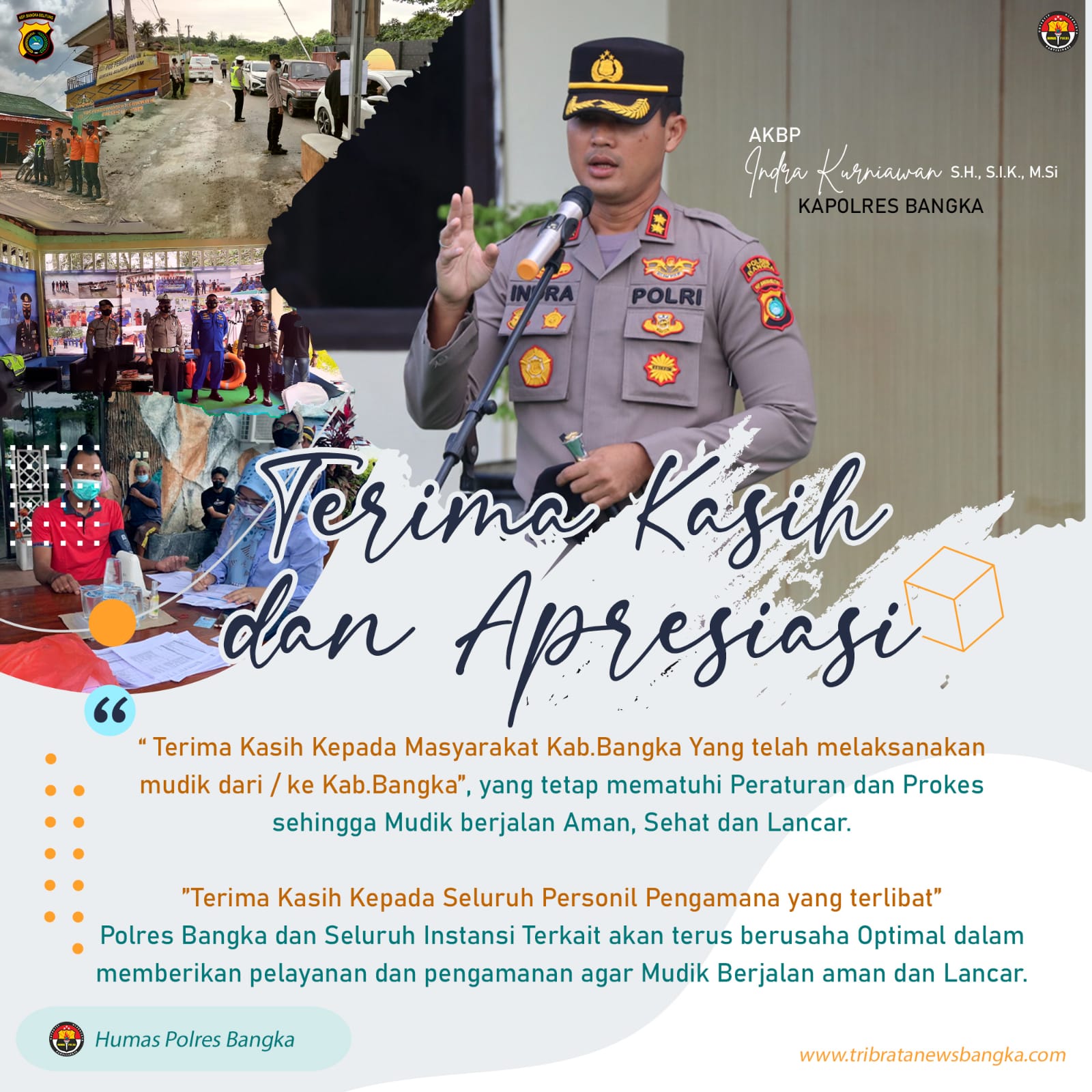 Dengna hal tersebut Kapolres Bangka AKBP Indra Kurniawan, S.H., S.I.K.,M.Si mengatakan terima kasih dan mengapresiasi kepada masyarakat Kab.Bangka yang melaksanakan mudik. selama hari Raya Idul Fitri atau lebaran tahun 2022 .