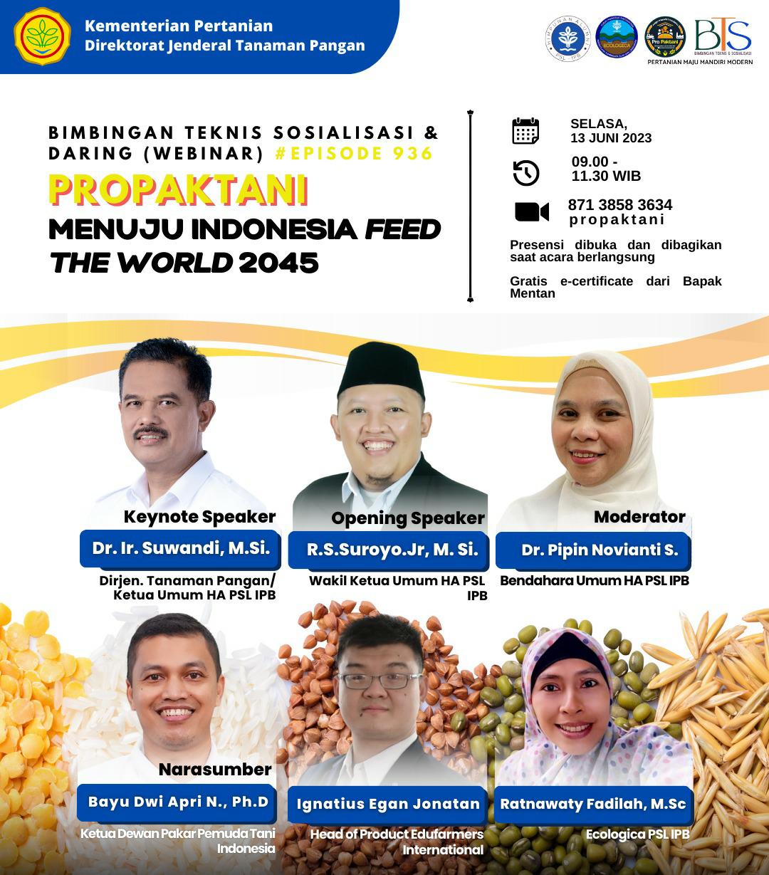 Poros Indonesia, Jakarta – Kementerian Pertanian (Kementan) melalui Direktorat Jenderal Tanaman Pangan menyelenggarakan kegiatan Bimbingan Teknis dan Sosialisasi (BTS) Propaktani Episode 936, pada dengan mengangkat tema “Menuju Indonesia Feed The World 2045” pada hari Selasa (13/6/2023). Hal ini untuk memperkuat upaya Indonesia sebagai membangun lumbung pangan dunia sehingga menghadapi tantangan global, ketahanan pangan Indonesia kuat dan bahkan mampu mencukupi kebubutuhan dunia.