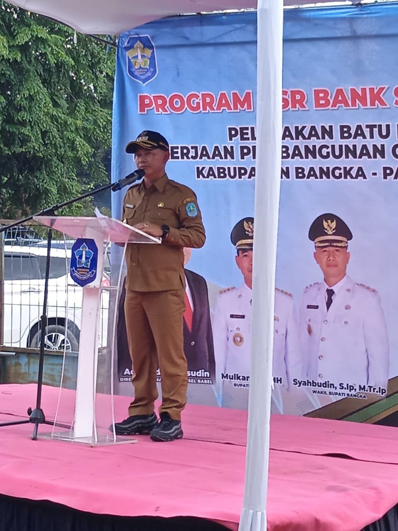 Assalamualaikum warahmatullahi wabarakatuh. Selamat siang dan salam sejahtera untuk kita semua Alhamdulillah pada hari ini atas dukungan dari bank Sumsel Babel. peletakan batu pertama yaitu pembangunan gapura dan langsung dilengkapi dengan captionnya nanti. untuk Media apa namanya Promosi ini memang anggaran melalui CSR kita Tahun 2022 yang kita usulkan. karena kami melihat belum ada tanda untuk menandai batas wilayah. tentunya antar wilayah kabupaten Bangka dengan Pangkal Pinang .sehingga dengan anggaran 2022 ini Kami mengusulkan ke bank Sumsel Babel yaitu membangun gapura agar dengan gapura inilah yang nanti salah satu memberi ciri khas terutama kepada masyarakat kita yang ada.