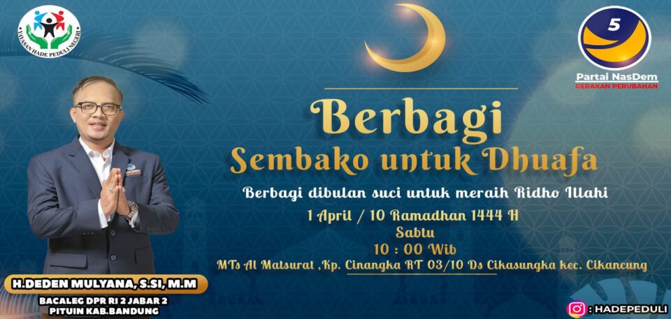 Ketua Yayasan Hade Peduli negeri Haji Deden mulyana mengadakan kegiatan sosial dibulan suci Ramadhan dengan memberikan Sembako kepada kaum dhuafa. Dalam kegiatan ini turut hadir ketua Yayasan Al ma’tsurat Haji Sutarma S.Pd Serta perwakilan dari kecamatan bapak Asep haedar S.Pd (bidang seni dan budaya).